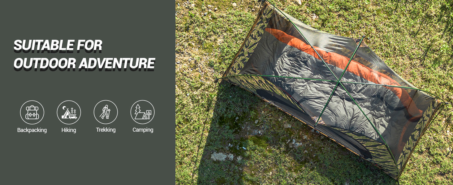1:Waterproof Ultralight 1P Tent: Weighs only 1.45kg/, Features 2000mm waterproof rating. Made of 20DN66 nylon with silicone coating, aluminum tent poles.