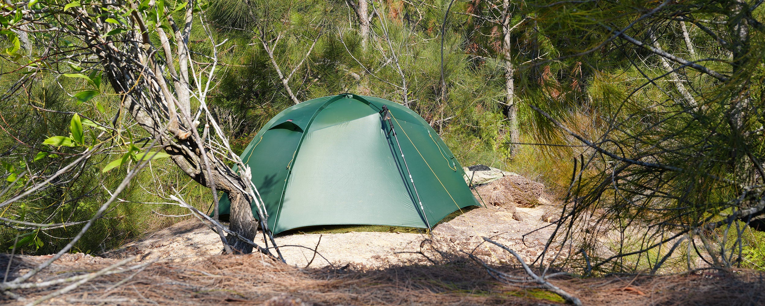 The tent can be reinforced using trekking poles for secondary support. Accessories are included to help secure the structure, making the tent more stable in strong wind and harsh environments.